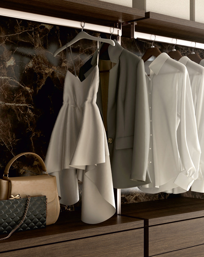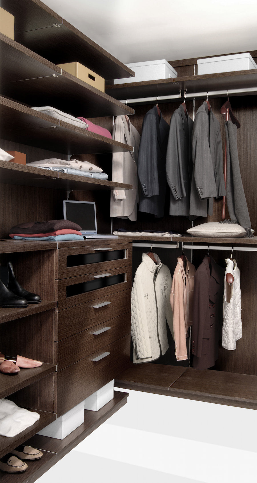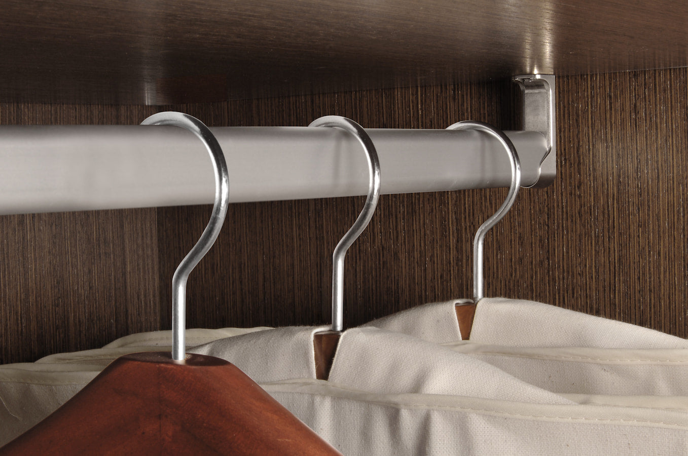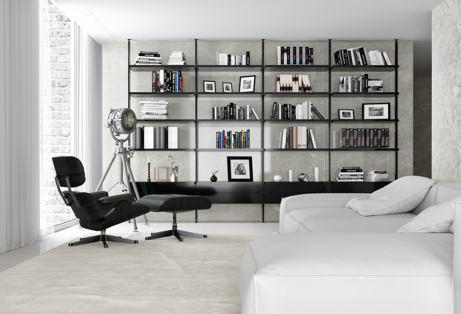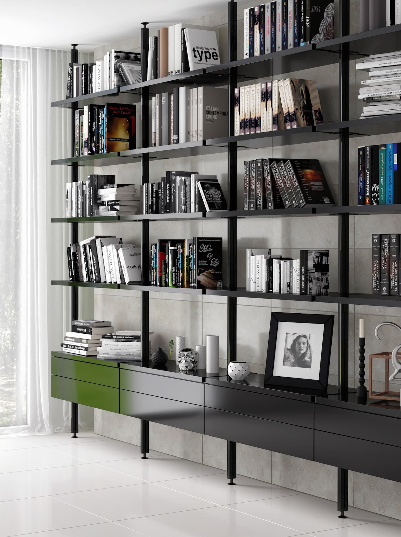 Organizing storage has never been easier, not to mention more fun! This contemporary modern storage solution features sleek aluminum posts spanned with shelf, drawer, and hanging rod infill components. This is your imagination running wild.